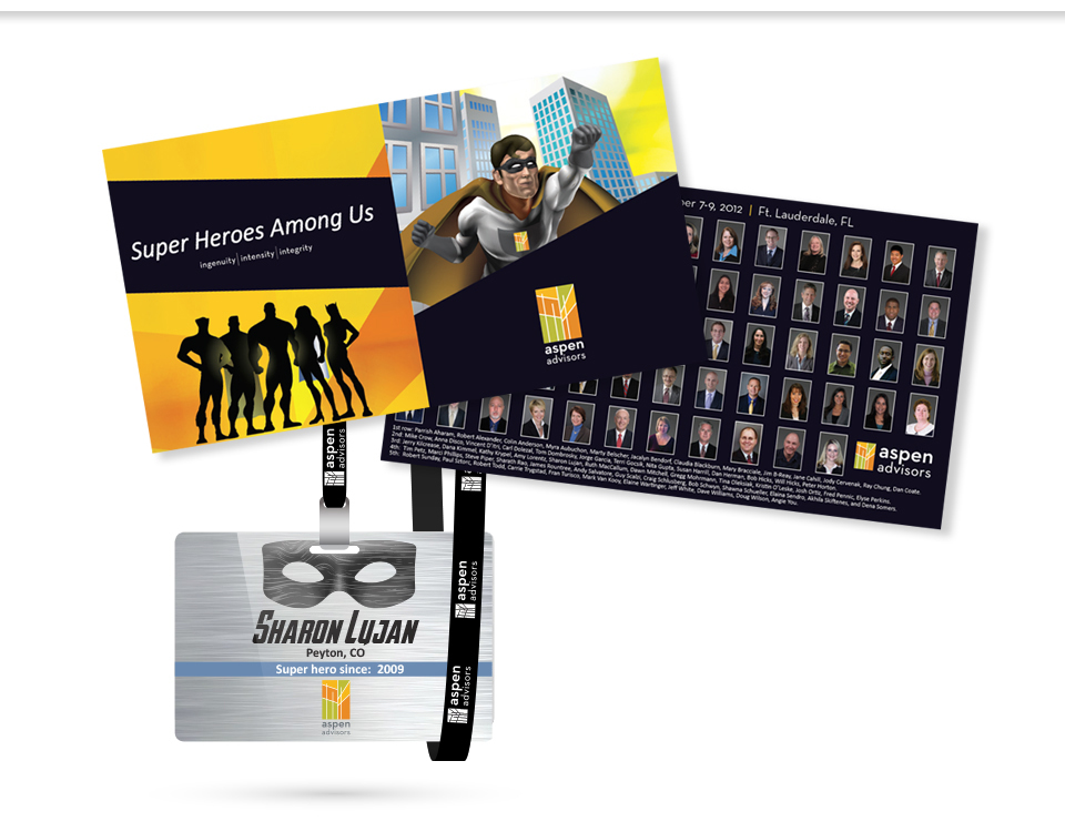 This line of dialogue dovetailed perfectly with Aspens’ mission, vision and values. The result was a superhero themed retreat that celebrated the individual and team achievements of Aspen employees during the year. Themed components included a short kick-off video, table top decorations, themed PowerPoint presentations, and a commemorative postcard.